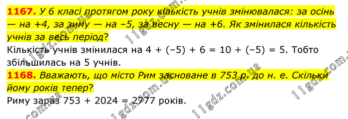 1167. У 6 класі протягом року кількість учнів змінювалася: за осінь — на +4, за зиму — на –5, за весну — на +6. Як змінилася кількість учнів за весь період? Кількість учнів змінилася на 4 + (–5) + 6 = 10 + (–5) = 5. Тобто збільшилась на 5 учнів. 1168. Вважають, що місто Рим засноване в 753 р. до н. е. Скільки йому років тепер? Риму зараз 753 + 2024 = 2777 років.