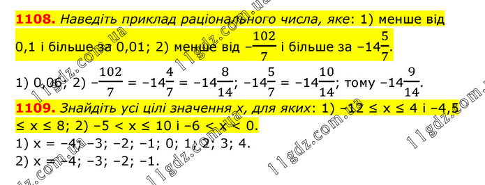1108. Наведіть приклад раціонального числа, яке: 1) менше від 0,1 і більше за 0,01; 2) менше від –102/7 і більше за –145/7. 1) 0,06; 2) –102/7 = –144/7 = –148/14; –145/7 = –1410/14; тому –149/14. 1109. Знайдіть усі цілі значення х, для яких: 1) –12 ≤ х ≤ 4 і –4,5 ≤ х ≤ 8; 2) –5 < х ≤ 10 і –6 < х < 0. 1) х = –4; –3; –2; –1; 0; 1; 2; 3; 4. 2) х = –4; –3; –2; –1.