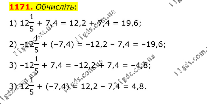 Обчисліть: 1) 121/5 + 7,4 = 12,2 + 7,4 = 19,6; 2) –121/5 + (–7,4) = –12,2 – 7,4 = –19,6; 3) –121/5 + 7,4 = –12,2 + 7,4 = –4,8; 3) 121/5 + (–7,4) = 12,2 – 7,4 = 4,8.