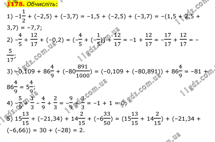 Обчисліть: 1) –11/2 + (–2,5) + (–3,7) = –1,5 + (–2,5) + (–3,7) = –(1,5 + 2,5 + 3,7) = –7,7; 2) –4/5 + 12/17 + (–0,2) = (–4/5 + (–1/5)) + 12/17 = –1 + 12/17 = –17/17 + 12/17 = –5/17; 3) –0,109 + 864/9 + (–80891/1000) = (–0,109 + (–80,891)) + 864/9 = –81 + 864/9 = 54/9; 4) –5/9 + 1/3 – 4/9 + 2/3 = –9/9 + 3/3 = –1 + 1 = 0; 5) 1513/15 + (–21,34) + 142/15 + (–633/50) = (1513/15 + 142/15) + (–21,34 + (–6,66)) = 30 + (–28) = 2.
