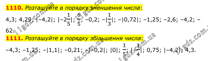 1110. Розташуйте в порядку зменшення числа: 4,3; 4,29; |–4,2|; |–21/5|; 6/5; –0,2; –|1/3|; –|0,72|; –1,25; –2,6; –4,2; –62. 1111. Розташуйте в порядку збільшення числа: –4,3; –1,25; –|1,1|; –0,21; –|–0,2|; |0|; 1/5; |–1/4|; 0,75; |–4,2|; 4,3.