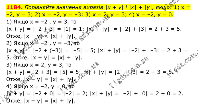 Порівняйте значення виразів |х + у| і |х| + |у|, якщо: 1) х = –2, у = 3; 2) х = –2, у = –3; 3) х = 2, у = 3; 4) х = –2, у = 0. 1) Якщо х = –2 , у = 3, то |х + у| = |–2 + 3| = |1| = 1; |х| + |y| = |–2| + |3| = 2 + 3 = 5. Отже, |х + y| < |х| + |y|. 2) Якщо х = –2 , у = –3, то |х + y| = |–2 + (–3)| = |–5| = 5; |х| + |y| = |–2| + |–3| = 2 + 3 = 5. Отже, |х + y| = |х| + |y|. 3) Якщо х = 2, у = 3, то |х + y| = |2 + 3| = |5| = 5; |х| + |y| = |2| + |3| = 2 + 3 = 5. Отже, |х + y| = |х| + |y|. 4) Якщо х = –2, у = 0, то |х + y| = |–2 + 0| = |–2| = 2; |х| + |y| = |–2| + |0| = 2 + 0 = 2. Отже, |х + y| = |х| + |у|.