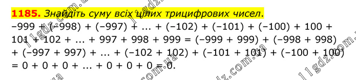 Знайдіть суму всіх цілих трицифрових чисел. –999 + (–998) + (–997) + ... + (–102) + (–101) + (–100) + 100 + 101 + 102 + ... + 997 + 998 + 999 = (–999 + 999) + (–998 + 998) + (–997 + 997) + ... + (–102 + 102) + (–101 + 101) + (–100 + 100) = 0 + 0 + 0 + ... + 0 + 0 + 0 = 0.