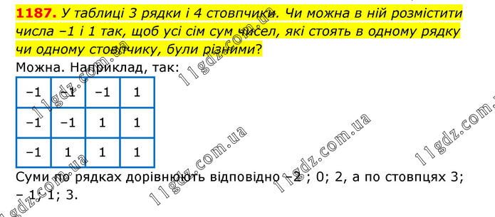У таблиці 3 рядки і 4 стовпчики. Чи можна в ній розмістити числа –1 i 1 так, щоб усі сім сум чисел, які стоять в одному рядку чи одному стовпчику, були різними? Можна. Наприклад, так: Суми по рядках дорівнюють відповідно –2 ; 0; 2, а по стовпцях 3; – 1; 1; 3.