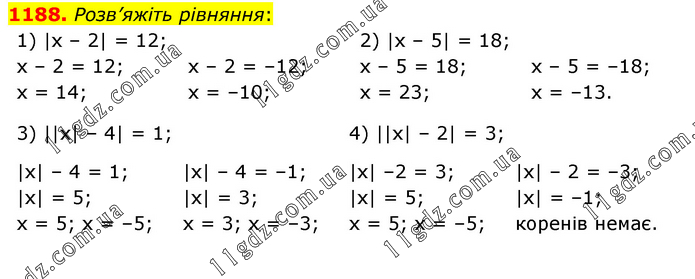 Розв’яжіть рівняння: 1) |х – 2| = 12; х – 2 = 12; х = 14; х – 2 = –12; х = –10; 2) |х – 5| = 18; х – 5 = 18; х = 23; х – 5 = –18; х = –13. 3) ||х| – 4| = 1; 4) ||х| – 2| = 3; |х| – 4 = 1; |х| = 5; х = 5; х = –5; |х| – 4 = –1; |х| = 3; х = 3; х = –3; |х| –2 = 3; |х| = 5; х = 5; х = –5; |х| – 2 = –3; |х| = –1; коренів немає.
