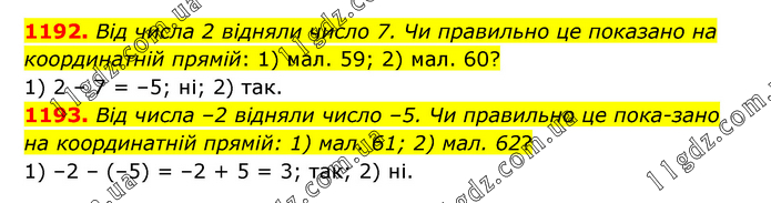 1192. Від числа 2 відняли число 7. Чи правильно це показано на координатній прямій: 1) мал. 59; 2) мал. 60? 1) 2 – 7 = –5; ні; 2) так. 1193. Від числа –2 відняли число –5. Чи правильно це показано на координатній прямій: 1) мал. 61; 2) мал. 62? 1) –2 – (–5) = –2 + 5 = 3; так; 2) ні.