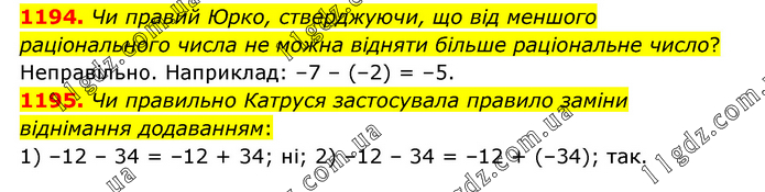 1194. Чи правий Юрко, стверджуючи, що від меншого раціонального числа не можна відняти більше раціональне число? Неправільно. Наприклад: –7 – (–2) = –5. 1195. Чи правильно Катруся застосувала правило заміни віднімання додаванням: 1) –12 – 34 = –12 + 34; ні; 2) –12 – 34 = –12 + (–34); так.
