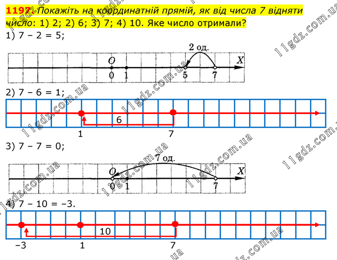 Покажіть на координатній прямій, як від числа 7 відняти число: 1) 2; 2) 6; 3) 7; 4) 10. Яке число отримали? 1) 7 – 2 = 5;