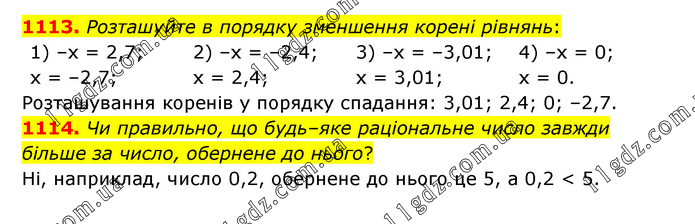 1113. Розташуйте в порядку зменшення корені рівнянь: 1) –х = 2,7; х = –2,7; 2) –х = –2,4; х = 2,4; 3) –х = –3,01; х = 3,01; 4) –х = 0; х = 0. Розташування коренів у порядку спадання: 3,01; 2,4; 0; –2,7. 1114. Чи правильно, що будь–яке раціональне число завжди більше за число, обернене до нього? Ні, наприклад, число 0,2, обернене до нього це 5, а 0,2 < 5.