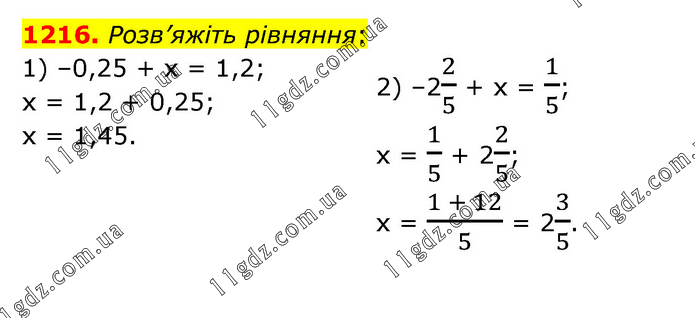 Розв’яжіть рівняння: 1) –0,25 + х = 1,2; х = 1,2 + 0,25; х = 1,45. 2) –22/5 + х = 1/5; х = 1/5 + 22/5; х = (1 + 12)/5 = 23/5.