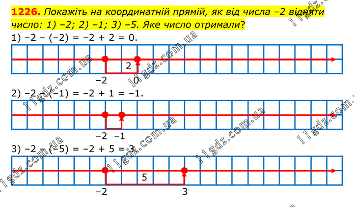 Покажіть на координатній прямій, як від числа –2 відняти число: 1) –2; 2) –1; 3) –5. Яке число отримали? 1) –2 – (–2) = –2 + 2 = 0. 2) –2 – (–1) = –2 + 1 = –1. 3) –2 – (–5) = –2 + 5 = 3.