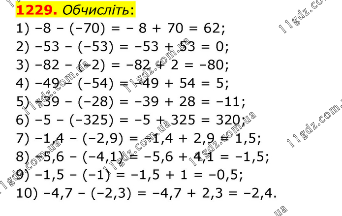 Обчисліть: 1) –8 – (–70) = – 8 + 70 = 62; 2) –53 – (–53) = –53 + 53 = 0; 3) –82 – (–2) = –82 + 2 = –80; 4) –49 – (–54) = –49 + 54 = 5; 5) –39 – (–28) = –39 + 28 = –11; 6) –5 – (–325) = –5 + 325 = 320; 7) –1,4 – (–2,9) = –1,4 + 2,9 = 1,5; 8) –5,6 – (–4,1) = –5,6 + 4,1 = –1,5; 9) –1,5 – (–1) = –1,5 + 1 = –0,5; 10) –4,7 – (–2,3) = –4,7 + 2,3 = –2,4.