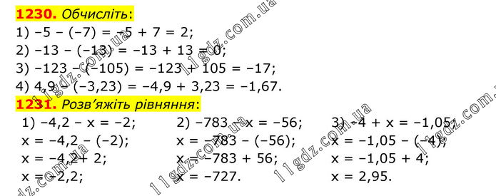 1230. Обчисліть: 1) –5 – (–7) = –5 + 7 = 2; 2) –13 – (–13) = –13 + 13 = 0; 3) –123 – (–105) = –123 + 105 = –17; 4) 4,9 – (–3,23) = –4,9 + 3,23 = –1,67. 1231. Розв’яжіть рівняння: 1) –4,2 – х = –2; х = –4,2 – (–2); x = –4,2+ 2; х = –2,2; 2) –783 – х = –56; х = –783 – (–56); х = –783 + 56; х = –727. 3) –4 + х = –1,05; х = –1,05 – (–4); х = –1,05 + 4; х = 2,95.
