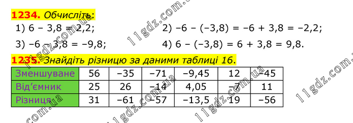 1234. Обчисліть: 1) 6 – 3,8 = 2,2; 2) –6 – (–3,8) = –6 + 3,8 = –2,2; 3) –6 – 3,8 = –9,8; 4) 6 – (–3,8) = 6 + 3,8 = 9,8. 1235. Знайдіть різницю за даними таблиці 16.