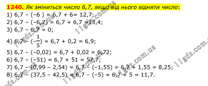 Як зміниться число 6,7, якщо від нього відняти число: 1) 6,7 – (–6 ) = 6,7 + 6= 12,7; 2) 6,7 – (–6,7) = 6,7 + 6,7 =13,4; 3) 6,7 – 6,7 = 0; 4) 6,7 – (–1/5) = 6,7 + 0,2 = 6,9; 5) 6,7 – (–0,02) = 6,7 + 0,02 = 6,72; 6) 6,7 – (–51) = 6,7 + 51 = 57,7; 7) 6,7 – (0,99 – 2,54) = 6,7 – (–1,55) = 6,7 + 1,55 = 8,25; 8) 6,7 – (37,5 – 42,5) = 6,7 – (–5) = 6,7 + 5 = 11,7.