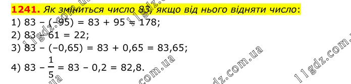 Як зміниться число 83, якщо від нього відняти число: 1) 83 – (–95) = 83 + 95 = 178; 2) 83 – 61 = 22; 3) 83 – (–0,65) = 83 + 0,65 = 83,65; 4) 83 – 1/5 = 83 – 0,2 = 82,8.