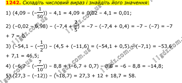 Складіть числовий вираз і знайдіть його значення: 1) (4,09 – (–1/50)) – 4,1 = 4,09 + 0,02 – 4,1 = 0,01; 2) (–0,02 – 6,98) – (–7,4 + 2/5) = –7 – (–7,4 + 0,4) = –7 – (–7) = –7 + 7 = 0. 3) (–54,1 – (–1/2)) – (4,5 + (–11,6) = (–54,1 + 0,5) – (–7,1) = –53,6 + 7,1 = 46,5; 4) (–6,7 – (–7/10)) – 8,8 = (–6,7 + 0,7) – 8,8 = –6 – 8,8 = –14,8; 5) (27,3 – (–12)) – (–18,7) = 27,3 + 12 + 18,7 = 58.