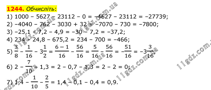 Обчисліть: 1) 1000 – 5627 – 23112 – 0 = –4627 – 23112 = –27739; 2) –4040 – 762 – 3030 + 32 = –7070 – 730 = –7800; 3) –25,1 – 7,2 – 4,9 = –30 – 7,2 = –37,2; 4) 234 – 24,8 – 675,2 = 234 – 700 = –466; 5) 3/8 – 1/16 – 31/2 = (6 - 1)/16 – 56/16 = 5/16 – 56/16 = –51/16 = –33/16; 6) 2 – 7/10 – 1,3 = 2 – 0,7 – 1,3 = 2 – 2 = 0; 7) 1,4 – 1/10 – 2/5 = 1,4 – 0,1 – 0,4 = 0,9.