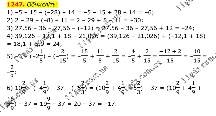 Обчисліть: 1) –5 – 15 – (–28) – 14 = –5 – 15 + 28 – 14 = –6; 2) 2 – 29 – (–8) – 11 = 2 – 29 + 8 – 11 = –30; 3) 27,56 – 36 – 27,56 – (–12) = 27,56 – 36 – 27,56 + 12 = –24; 4) 39,126 – 12,1 + 18 – 21,026 = (39,126 – 21,026) + (–12,1 + 18) = 18,1 + 5,9 = 24; 5) –3 – (–21/5) – (–2/15) = –15/5 + 11/5 + 2/15 = –4/5 + 2/15 = (-12 + 2)/15 = –10/15 = –2/3; 6) 102/9 – (–41/9) – 37 – (–52/3) = (102/9 + 41/9 + 52/3) – 37 = (102/9 + 41/9 + 56/9) – 37 = 199/9 – 37 = 20 – 37 = –17.