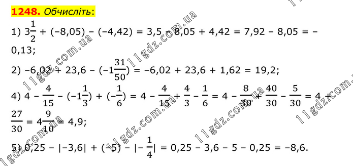 Обчисліть: 1) 31/2 + (–8,05) – (–4,42) = 3,5 – 8,05 + 4,42 = 7,92 – 8,05 = –0,13; 2) –6,02 + 23,6 – (–131/50) = –6,02 + 23,6 + 1,62 = 19,2; 4) 4 – 4/15 – (–11/3) + (–1/6) = 4 – 4/15 + 4/3 – 1/6 = 4 – 8/30 + 40/30 – 5/30 = 4 + 27/30 = 49/10 = 4,9; 5) 0,25 – |–3,6| + (–5) – |– 1/4| = 0,25 – 3,6 – 5 – 0,25 = –8,6.