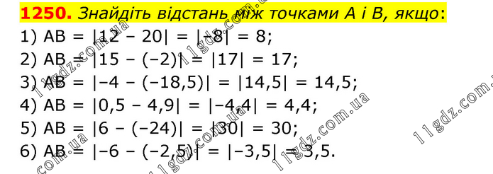 Знайдіть відстань між точками A i В, якщо: 1) АВ = |12 – 20| = |–8| = 8; 2) АВ = |15 – (–2)| = |17| = 17; 3) АВ = |–4 – (–18,5)| = |14,5| = 14,5; 4) АВ = |0,5 – 4,9| = |–4,4| = 4,4; 5) АВ = |6 – (–24)| = |30| = 30; 6) АВ = |–6 – (–2,5)| = |–3,5| = 3,5.