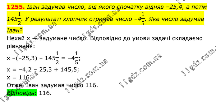 Іван задумав число, від якого спочатку відняв –25,4, а потім 1451/2. У результаті хлопчик отримав число –41/5. Яке число задумав Іван? Нехай х — задумане число. Відповідно до умови задачі складаємо рівняння: х –(–25,3) – 1451/2 = –41/5; х = –4,2 – 25,3 + 145,5; х = 116. Отже, Іван задумав число 116. Відповідь: 116.