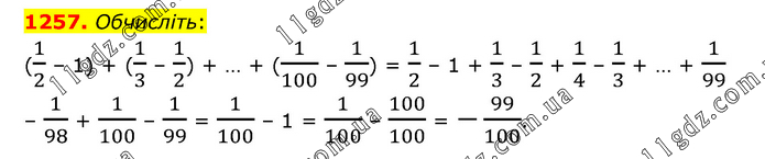 Обчисліть: (1/2 – 1) + (1/3 – 1/2) + … + (1/100 – 1/99) = 1/2 – 1 + 1/3 – 1/2 + 1/4 – 1/3 + … + 1/99 – 1/98 + 1/100 – 1/99 = 1/100 – 1 = 1/100 – 100/100 = -99/100.