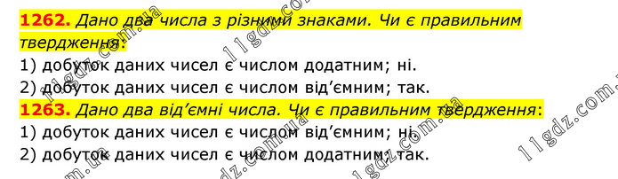 1262. Дано два числа з різними знаками. Чи є правильним твердження: 1) добуток даних чисел є числом додатним; ні. 2) добуток даних чисел є числом від’ємним; так. 1263. Дано два від’ємні числа. Чи є правильним твердження: 1) добуток даних чисел є числом від’ємним; ні. 2) добуток даних чисел є числом додатним; так.