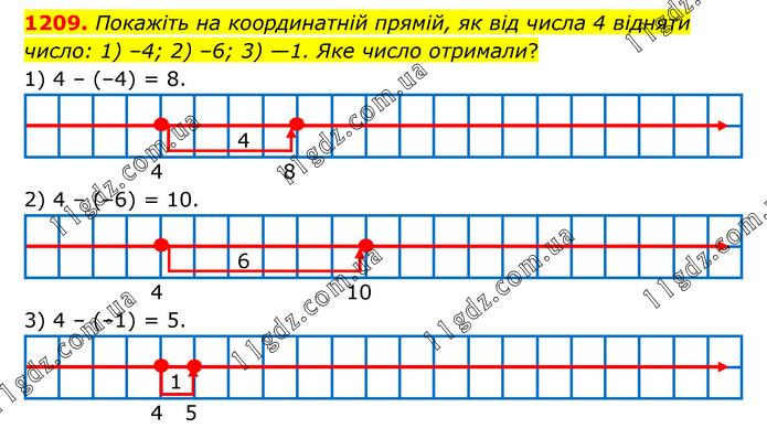 1209. Покажіть на координатній прямій, як від числа 4 відняти число: 1) –4; 2) –6; 3) —1. Яке число отримали? 1) 4 – (–4) = 8. 2) 4 – (–6) = 10. 3) 4 – (–1) = 5.