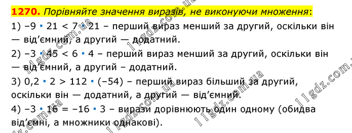 Порівняйте значення виразів, не виконуючи множення: 1) –9 ∙ 21 < 7 ∙ 21 – перший вираз менший за другий, оскільки він — від’ємний, а другий — додатний. 2) –3 ∙ 45 < 6 ∙ 4 – перший вираз менший за другий, оскільки він — від’ємний, а другий – додатний. 3) 0,2 ∙ 2 > 112 ∙ (–54) – перший вираз більший за другий, оскільки він — додатний, а другий — від’ємний. 4) –3 ∙ 16 = –16 ∙ 3 – вирази дорівнюють один одному (обидва від’ємні, а множники однакові).