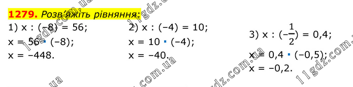 Розв’яжіть рівняння: 1) х : (–8) = 56; х = 56 ∙ (–8); х = –448. 2) х : (–4) = 10; х = 10 ∙ (–4); х = –40. 3) х : (–1/2) = 0,4; х = 0,4 ∙ (–0,5); х = –0,2.