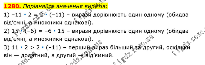 Порівняйте значення виразів: 1) –11 ∙ 2 = 2 ∙ (–11) – вирази дорівнюють один одному (обидва від’ємні, а множники однакові). 2) 15 ∙ (–6) = –6 ∙ 15 – вирази дорівнюють один одному (обидва від’ємні, а множники однакові). 3) 11 ∙ 2 > 2 ∙ (–11) – перший вираз більший за другий, оскільки він — додатний, а другий — від’ємний.