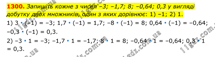 Запишіть кожне з чисел –3; –1,7; 8; –0,64; 0,3 у вигляді добутку двох множників, один з яких дорівнює: 1) –1; 2) 1. 1) 3 ∙ (–1) = –3; 1,7 ∙ (–1) = 1,7; –8 ∙ (–1) = 8; 0,64 ∙ (–1) = –0,64; –0,3 ∙ (–1) = 0,3. 2) –3 ∙ 1 = –3; –1,7 ∙ 1 = –1,7; 8 ∙ 1 = 8; –0,64 ∙ 1 = –0,64; 0,3 ∙ 1 = 0,3.