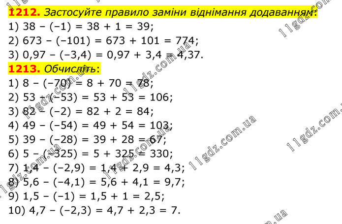 1212. Застосуйте правило заміни віднімання додаванням: 1) 38 – (–1) = 38 + 1 = 39; 2) 673 – (–101) = 673 + 101 = 774; 3) 0,97 – (–3,4) = 0,97 + 3,4 = 4,37. 1213. Обчисліть: 1) 8 – (–70) = 8 + 70 = 78; 2) 53 – (–53) = 53 + 53 = 106; 3) 82 – (–2) = 82 + 2 = 84; 4) 49 – (–54) = 49 + 54 = 103; 5) 39 – (–28) = 39 + 28 = 67; 6) 5 – (–325) = 5 + 325 = 330; 7) 1,4 – (–2,9) = 1,4 + 2,9 = 4,3; 8) 5,6 – (–4,1) = 5,6 + 4,1 = 9,7; 9) 1,5 – (–1) = 1,5 + 1 = 2,5; 10) 4,7 – (–2,3) = 4,7 + 2,3 = 7.