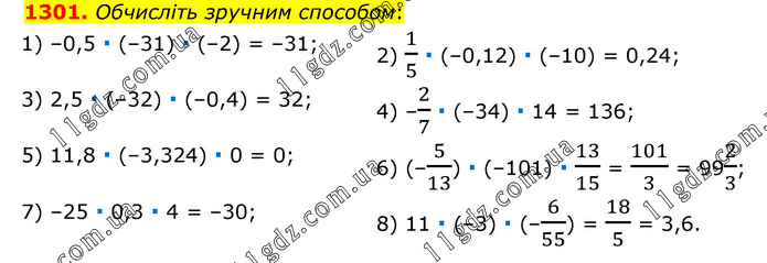 Обчисліть зручним способом: 1) –0,5 ∙ (–31) ∙ (–2) = –31; 2) 1/5 ∙ (–0,12) ∙ (–10) = 0,24; 3) 2,5 ∙ (–32) ∙ (–0,4) = 32; 4) –2/7 ∙ (–34) ∙ 14 = 136; 5) 11,8 ∙ (–3,324) ∙ 0 = 0; 6) (–5/13) ∙ (–101) ∙ 13/15 = 101/3 = 992/3; 7) –25 ∙ 0,3 ∙ 4 = –30; 8) 11 ∙ (–3) ∙ (–6/55) = 18/5 = 3,6.