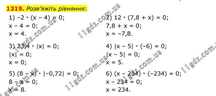 Розв’яжіть рівняння: 1) –2 ∙ (х – 4) = 0; х – 4 = 0; х = 4. 2) 12 ∙ (7,8 + х) = 0; 7,8 + х = 0; х = –7,8. 3) 23,4 ∙ |х| = 0; |х| = 0; х = 0; 4) |х – 5| ∙ (–6) = 0; |х – 5| = 0; х = 5. 5) (8 – х) ∙ |–0,72| = 0; 8 – х = 0; х = 8. 6) (х – 234) ∙ (–234) = 0; х – 234 = 0; х = 234.