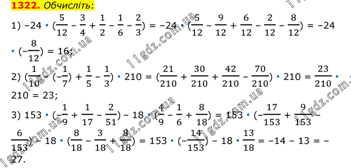 Обчисліть: 1) –24 ∙ (5/12 – 3/4 + 1/2 – 1/6 – 2/3) = –24 ∙ (5/12 – 9/12 + 6/12 – 2/12 – 8/12) = –24 ∙ (–8/12) = 16; 2) (1/10 – (–1/7) + 1/5 – 1/3) ∙ 210 = (21/210 + 30/210 + 42/210 – 70/210) ∙ 210 = 23/210 ∙ 210 = 23; 3) 153 ∙ (–1/9 + 1/17 – 2/51) – 18 ∙ (4/9 – 1/6 + 8/18) = 153 ∙ (–17/153 + 9/153 – 6/153) – 18 ∙ (8/18 – 3/18 + 8/18) = 153 ∙ (–14/153) – 18 ∙ 13/18 = –14 – 13 = –27.