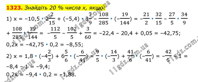 Знайдіть 20 % числа х, якщо: 1) x = –10,5 ∙ 22/15 + (–5,4) ∙ 37/9 – 108/285 ∙ (–19/144) = –21/2 ∙ 32/15 – 27/5 ∙ 34/9 + 108/285 ∙ 19/144 = –112/5 – 102/5 + 3/60 = –22,4 – 20,4 + 0,05 = –42,75; 0,2x = –42,75 ∙ 0,2 = –8,55; 2) x = 1,8 ∙ (–42/3) + 65/6 ∙ (–6/41) = 9/5 ∙ (–14/3) + 41/6 ∙ (–6/41) = –42/5 – 1 = –8,4 – 1 = –9,4; 0,2x = –9,4 ∙ 0,2 = –1,88.