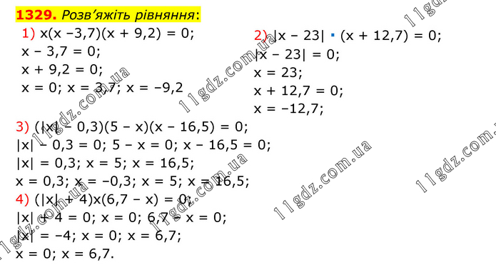 Розв’яжіть рівняння: 1) x(x –3,7)(x + 9,2) = 0; x – 3,7 = 0; x + 9,2 = 0; x = 0; x = 3,7; x = –9,2 2) |x – 23| ∙ (x + 12,7) = 0; |х – 23| = 0; x = 23; x + 12,7 = 0; x = –12,7; 3) (|x| – 0,3)(5 – x)(x – 16,5) = 0; |x| – 0,3 = 0; 5 – x = 0; x – 16,5 = 0; |x| = 0,3; x = 5; x = 16,5; x = 0,3; x = –0,3; x = 5; x = 16,5; 4) (|x| + 4)x(6,7 – x) = 0; |x| + 4 = 0; x = 0; 6,7 – x = 0; |x| = –4; x = 0; x = 6,7; x = 0; x = 6,7.