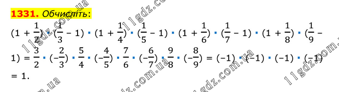 Обчисліть: (1 + 1/2) ∙ (1/3 – 1) ∙ (1 + 1/4) ∙ (1/5 – 1) ∙ (1 + 1/6) ∙ (1/7 – 1) ∙ (1 + 1/8) ∙ (1/9 – 1) = 3/2 ∙ (–2/3) ∙ 5/4 ∙ (–4/5) ∙ 7/6 ∙ (–6/7) ∙ 9/8 ∙ (–8/9) = (–1) ∙ (–1) ∙ (–1) ∙ (–1) = 1.