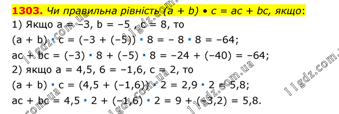 Чи правильна рівність (а + b) • с = ас + bс, якщо: 1) Якщо а = –З, b = –5 , с = 8, то (а + b) ∙ с = (–3 + (–5)) ∙ 8 = – 8 ∙ 8 = –64; ас + bс = (–3) ∙ 8 + (–5) ∙ 8 = –24 + (–40) = –64; 2) якщо а = 4,5, 6 = –1,6, с = 2, то (a + b) ∙ с = (4,5 + (–1,6)) ∙ 2 = 2,9 ∙ 2 = 5,8; ас + bс = 4,5 ∙ 2 + (–1,6) ∙ 2 = 9 + (–3,2) = 5,8.