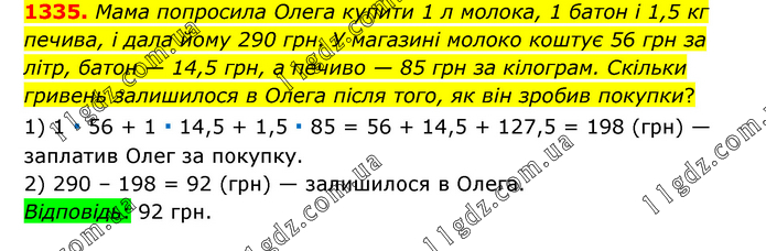 Мама попросила Олега купити 1 л молока, 1 батон і 1,5 кг печива, і дала йому 290 грн. У магазині молоко коштує 56 грн за літр, батон — 14,5 грн, а печиво — 85 грн за кілограм. Скільки гривень залишилося в Олега після того, як він зробив покупки? 1) 1 ∙ 56 + 1 ∙ 14,5 + 1,5 ∙ 85 = 56 + 14,5 + 127,5 = 198 (грн) — заплатив Олег за покупку. 2) 290 – 198 = 92 (грн) — залишилося в Олега. Відповідь: 92 грн.