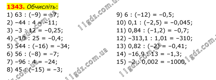 Обчисліть: 1) 63 : (–9) = –7; 2) –44 : 4 = –11; 3) –3 : 12 = –0,25; 4) –10 : 25 = –0,4; 5) 544 : (–16) = –34; 6) 56 : (–8) = –7; 7) –96 : 4 = –24; 8) 45 : (–15) = –3; 9) 6 : (–12) = –0,5; 10) 0,1 : (–2,5) = –0,045; 11) 0,84 : (–1,2) = –0,7; 12) –313,1 : 1,01 = –310; 13) 0,82 : (–2) = –0,41; 14) –16,9 : 13 = –1,3; 15) –2 : 0,002 = –1000.