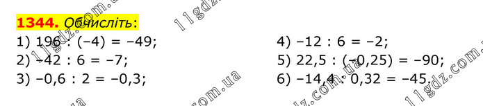 Обчисліть: 1) 196 : (–4) = –49; 2) –42 : 6 = –7; 3) –0,6 : 2 = –0,3; 4) –12 : 6 = –2; 5) 22,5 : (–0,25) = –90; 6) –14,4 : 0,32 = –45.