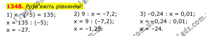 Розв’яжіть рівняння: 1) х ∙ (–5) = 135; х = 135 : (–5); х = –27. 2) 9 : х = –7,2; х = 9 : (–7,2); х = –1,25. 3) –0,24 : х = 0,01; х = –0,24 : 0,01; х = –24.