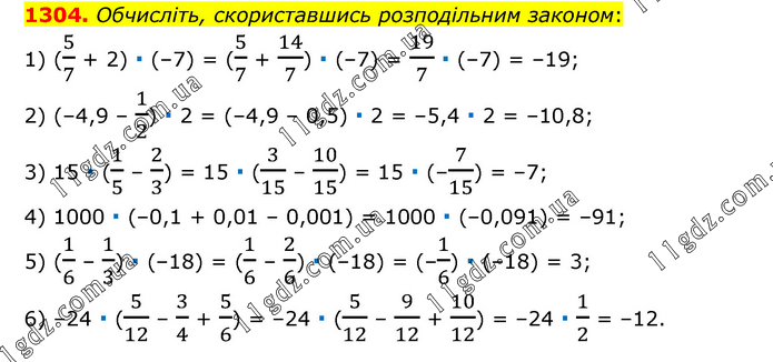Обчисліть, скориставшись розподільним законом: 1) (5/7 + 2) ∙ (–7) = (5/7 + 14/7) ∙ (–7) = 19/7 ∙ (–7) = –19; 2) (–4,9 – 1/2) ∙ 2 = (–4,9 – 0,5) ∙ 2 = –5,4 ∙ 2 = –10,8; 3) 15 ∙ (1/5 – 2/3) = 15 ∙ (3/15 – 10/15) = 15 ∙ (–7/15) = –7; 4) 1000 ∙ (–0,1 + 0,01 – 0,001) = 1000 ∙ (–0,091) = –91; 5) (1/6 – 1/3) ∙ (–18) = (1/6 – 2/6) ∙ (–18) = (–1/6) ∙ (–18) = 3; 6) –24 ∙ (5/12 – 3/4 + 5/6) = –24 ∙ (5/12 – 9/12 + 10/12) = –24 ∙ 1/2 = –12.