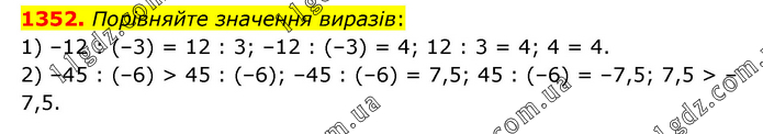 Порівняйте значення виразів: 1) –12 : (–3) = 12 : 3; –12 : (–3) = 4; 12 : 3 = 4; 4 = 4. 2) –45 : (–6) > 45 : (–6); –45 : (–6) = 7,5; 45 : (–6) = –7,5; 7,5 > –7,5.