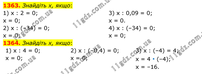 1363. Знайдіть х, якщо: 1) х : 2 = 0; х = 0; 2) х : (–34) = 0; х = 0; 3) х : 0,09 = 0; х = 0. 4) х : (–34) = 0; х = 0; 1364. Знайдіть х, якщо: 1) х : 4 = 0; х = 0; 2) х : (–0,4) = 0; х = 0; 3) х : (–4) = 4; х = 4 ∙ (–4); х = –16.