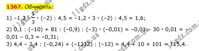 Обчисліть: 1) –1,2 : 1/3 ∙ (–2) : 4,5 = –1,2 ∙ 3 ∙ (–2) : 4,5 = 1,6; 2) 0,1 : (–10) + 81 : (–0,9) : (–3) ∙ (–0,01) = –0,01 – 30 ∙ 0,01 = –0,01 – 0,3 = –0,31; 3) 4,4 – 2,4 : (–0,24) + (–1212) : (–12) = 4,4 + 10 + 101 = 115,4.