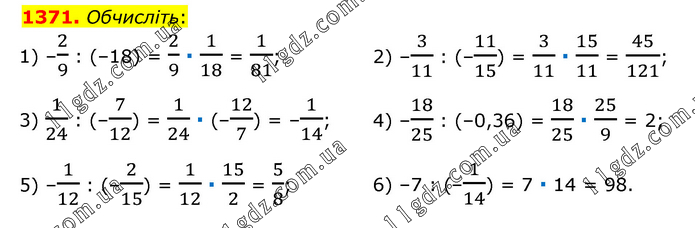 Обчисліть: 1) –2/9 : (–18) = 2/9 ∙ 1/18 = 1/81; 2) –3/11 : (–11/15) = 3/11 ∙ 15/11 = 45/121; 3) 1/24 : (–7/12) = 1/24 ∙ (–12/7) = –1/14; 4) –18/25 : (–0,36) = 18/25 ∙ 25/9 = 2; 5) –1/12 : (–2/15) = 1/12 ∙ 15/2 = 5/8; 6) –7 : (–1/14) = 7 ∙ 14 = 98.